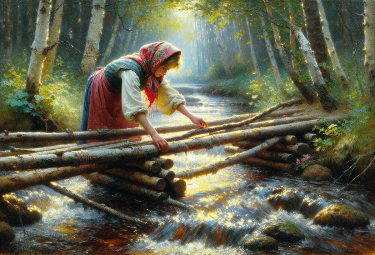 В уютной избушке на опушке леса жила-была девочка по имени Алёнушка. Была она красивая, с русой косой до пояса и голубыми глазами, но уж очень ленивая. Целыми днями Алёнушка лежала на печке, сказки слушала да семечки лузгала. Ни помочь матери по хозяйству, ни в лес по грибы-ягоды сходить – ничего ей не хотелось делать. — Алёнушка, доченька, – говорила ей мать, – сходи к речке, воды набери, а то и чай попить не с чем. — Ой, матушка, не хочется, – отвечала Алёнушка, потягиваясь на печке. – Ноги болят, голова кружится. Вздыхала мать, брала вёдра и сама шла к речке. Так и проходили дни за днями, Алёнушка всё ленилась, а мать за неё всё делала. Однажды летом, когда солнце припекало особенно сильно, захотелось Алёнушке малины. Вспомнила она, что на другом берегу речки, в лесу, есть малинник. Соскочила она с печки, надела сарафан и побежала к речке. Но не тут-то было! Мостик через речку давно прогнил и сломался, а перепрыгнуть речку Алёнушка не могла – слаба была от лени. Села она на бережку