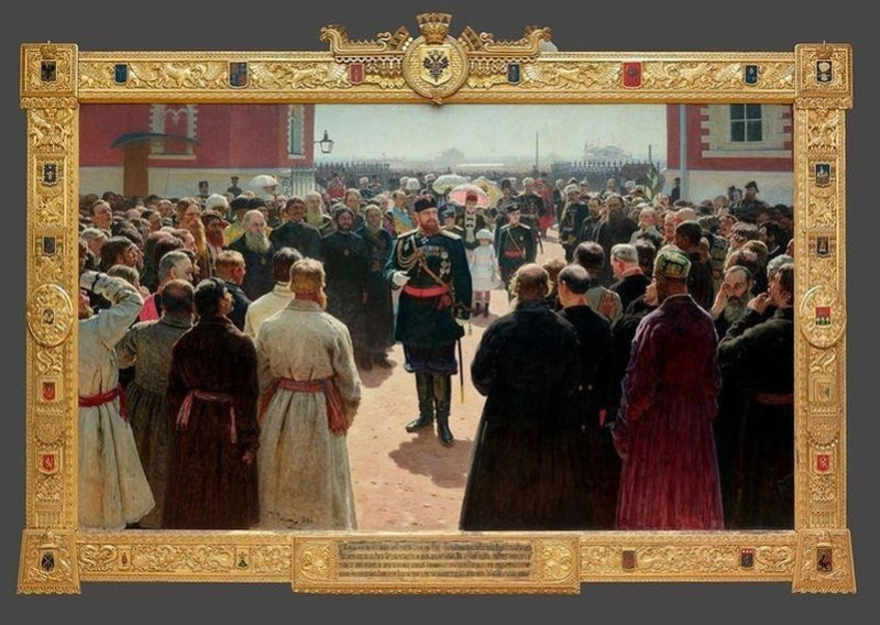 А это внук Николая I, император Александр III среди своих подданных: Илья Репин. Приём волостных старшин императором Александром III во дворе Петровского дворца в Москве. 1884—1886