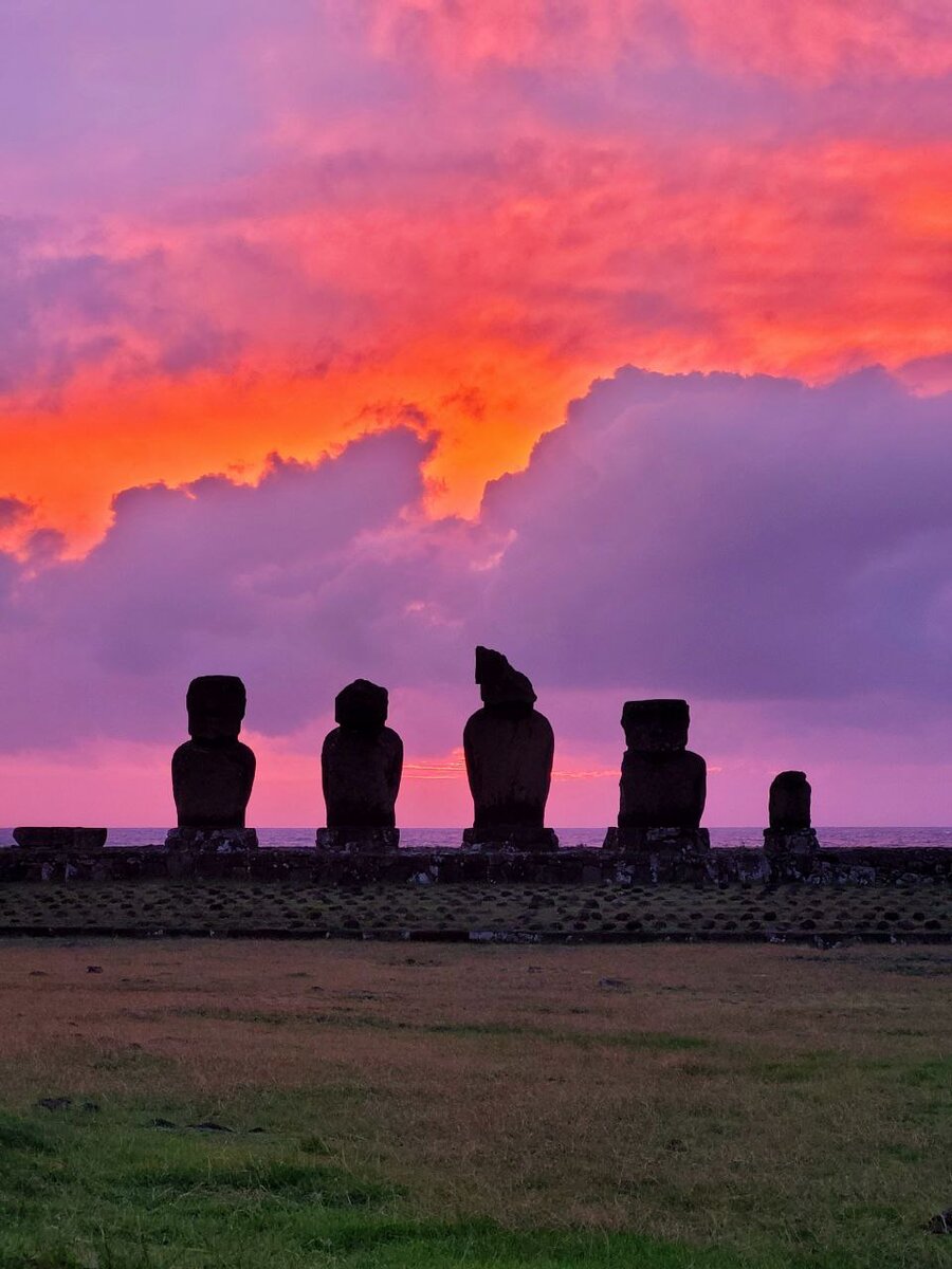 В последний день на острове я пошла на закатный пойнт. Там красиво: несколько моаи в ряд, один отдельно в шапочке, и за ними эпично садится солнце. Это был неверноятнейший закат с раскрашиванием неба в разные цвета каждую минуту и постепенным погружением острова в полную тьму. Любоваться закатом собрались почти все туристы, которые в этот день были на острове.