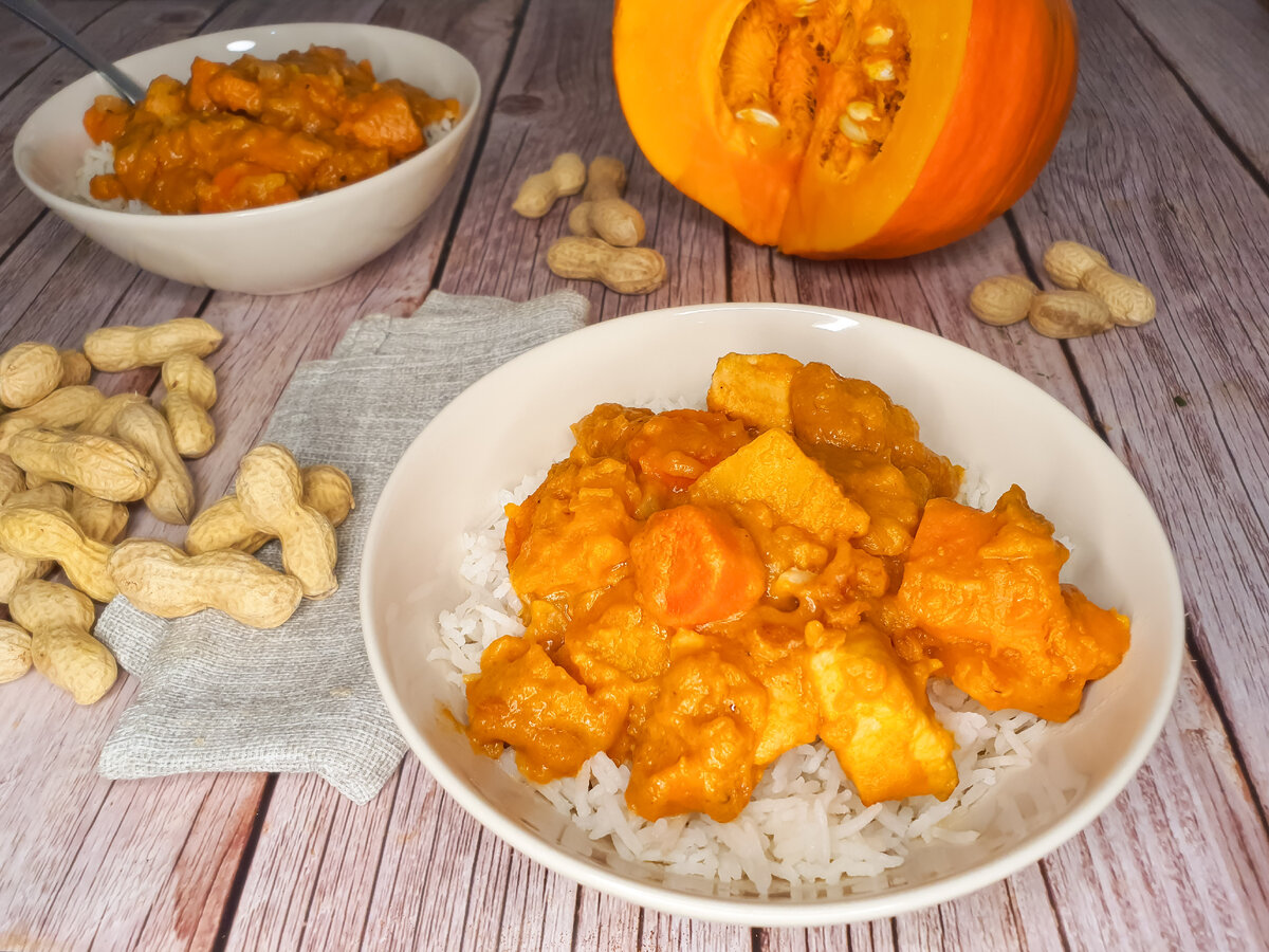 Это блюдо родом из Африки, и вряд ли многие ваши знакомые часто наслаждаются африканской кухней. Так что если вы хотите кого-то удивить новым блюдом – вам сюда. При этом вкус у блюда совсем не экзотический и вряд ли вызовет у вас огромное удивление. Интересный и необычный вкус соусу придает арахисовая паста, и в этом собственно основная фишка блюда. Необычных продуктов тут тоже нет, разве что батат бывает не так популярен как картофель, но они тут вполне взаимозаменяемы. Кстати, вы не только можете менять состав и пропорцию овощей, но и сделать вегетарианскую версию, убрав курицу и заменив куриный бульон овощным. Как у любых национальных блюд, у этого рагу есть множество версий, а я расскажу вариант, который выбрала для себя. Нам понадобится: 300 гр куриного филе, луковица, 3 зубчика чеснока, 300 гр тыквы, средний батат, 2 моркови, помидор, 3 мелких перца чили или один крупный, 2 ст.л. томатной пасты, 500 мл куриного или овощного бульона, 3 ст.л. несладкой арахисовой пасты, 2 ч.л. п
