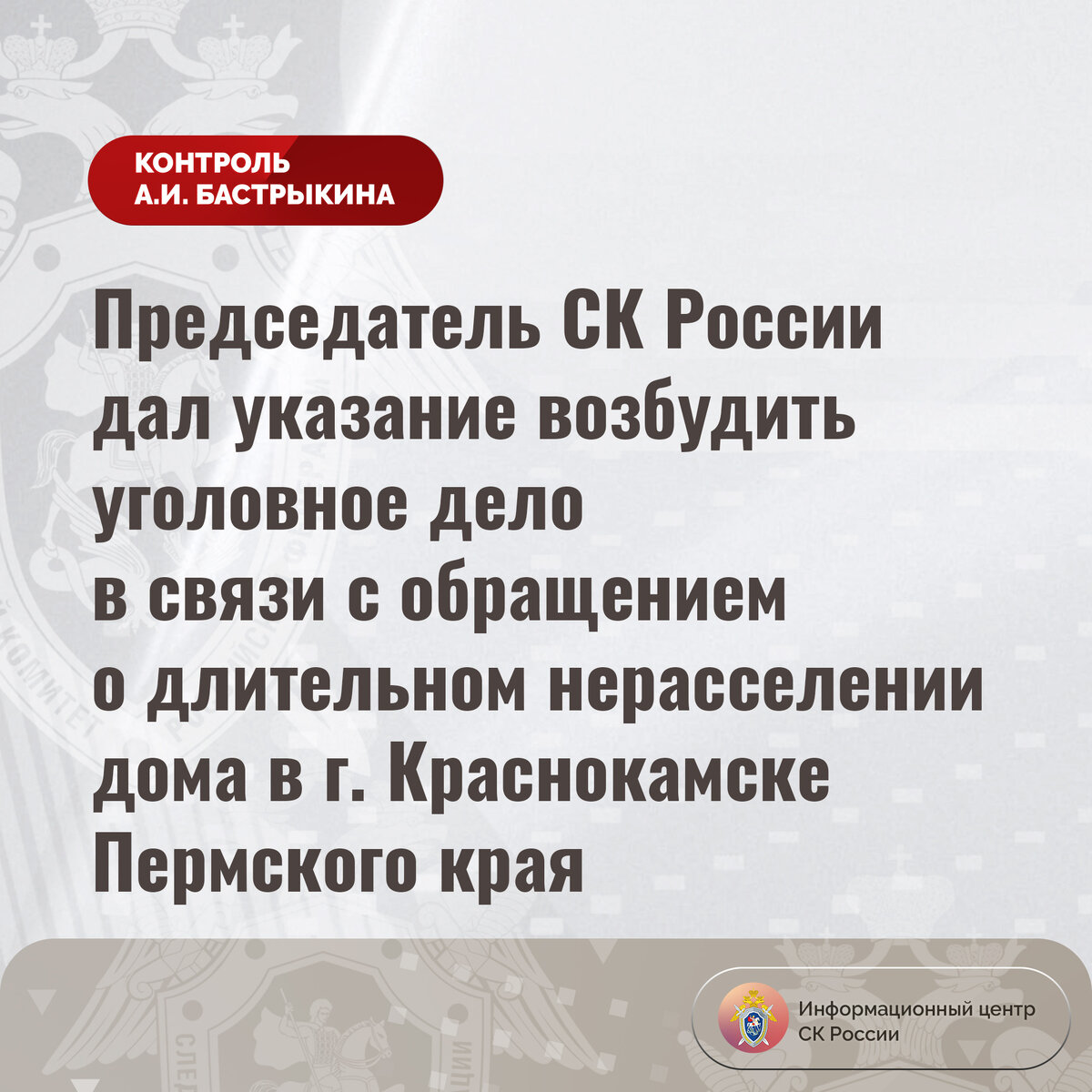 Председатель СК России дал указание возбудить уголовное дело в связи с обращением о длительном нерасселении дома в г. Краснокамске Пермского края