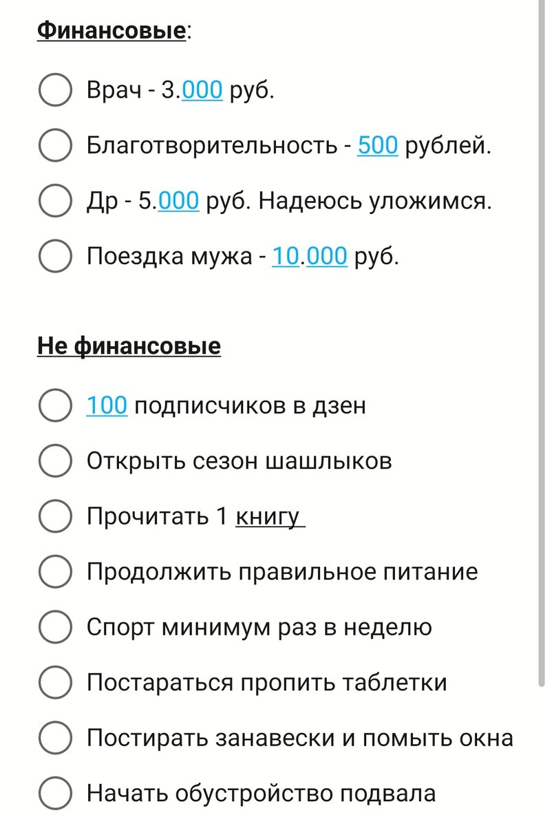 С наступлением весны и белых ночей появляется желание жить, планировать и действовать 🍀 Всем привет. Вы на канале Дневник экономного дома. Здесь я рассказываю об экономии, финансовом планировании, накоплениях и просто о жизни обычной семьи. Буду рада новым знакомствам. Итак, для начала подведём итоги за прошедший апрель месяц. О нем я писала тут: ❓Врачи - анализы то я конечно сдала✅но вот к стоматологу не сходила ⛔ ✅Подарок родственнику подарен ✅Коррекцию перманентного макияжа сделала ✅Сессию закрыли ⛔Ремонт не начали ⛔Долг не отдали ⛔100 подписчиков тут не набрала ⛔Книгу не прочитала ⛔Обучение по работе не прошла ❓Английский язык не начала, но приложение скачала ⛔Финансовую грамотность не ищучала ⛔Спорт тоже отошёл в сторонку ✅Врача посетила ✅Зимнюю одежду убрала Как итог больше половины я не сделала. Что меня конечно очень опечалило. Но я можно сказать отдыхала. Теперь планы на май: А какие планы у вас?)