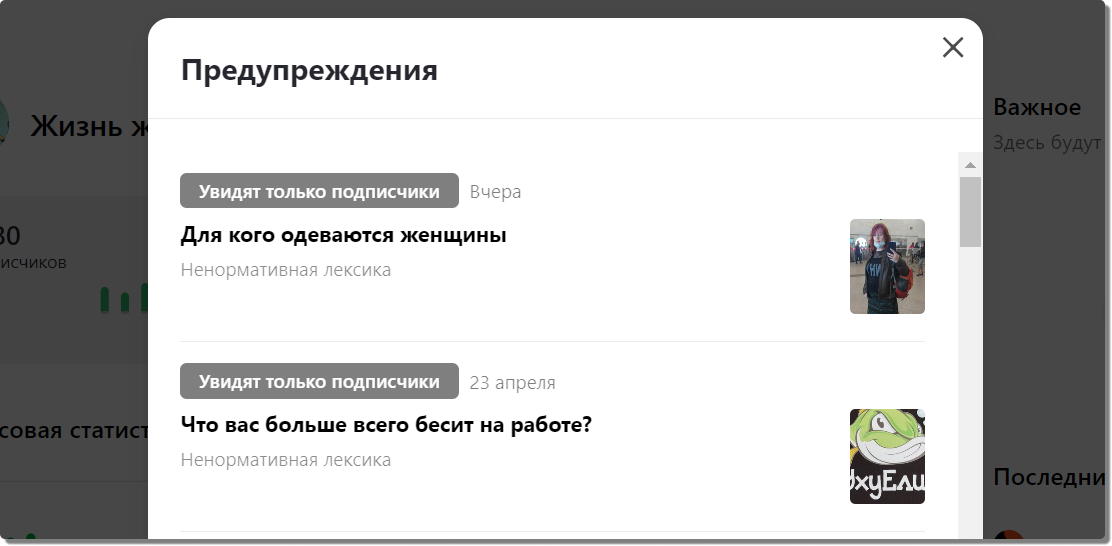 Проверять папку "Предупреждения" я привыкла давно, даже если публикую исключительно песика и виды пейзажей. Что именно оскорбит чувства "площадки для всех" - реально предугадать невозможно, бомба может грохнуть в любой момент. Я уже и так кат...стерилизовала по полной свои тексты, целомудренно заменила все потенциально могущие счесться неприличными части тема (часть есть, а слова нет!) на такие же выхолощенные аналоги. процессах вообще стараюсь не писать. Долго удавалось продержаться. И тут! Захожу в "Предупреждения" - а там аж две статьи нанесли непоправимый урон хрупкой нервной системе пользователей - о ужас! - ненормативной лексикой! Божечки, да что ж я себе там позволила такое ненормативное, в каком помутнении писала все одно из целых 4 слов обсценной лексики?! Иду искать. Ищу... Все еще ищу... И вы знаете - не нахожу! Нет, я не склонна впадать в панику и истерику, я законопослушный котег - я пишу в техподдержку: объясните, мол неразумной, какое из написанных слов было опознано