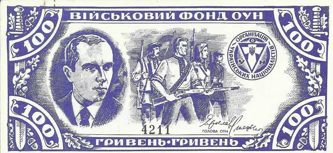 По сути, эти бумаги не были какими-то деньгами, потому как нигде в официальном обороте не находились. Фактически это была выдуманная самими бандеровцами денежная единица, которую зачастую просто заставляли менять мирное население на реальные деньги под предлогом того, что "вот скоро независимость придет, и это будет основная денежная единица". Ну это все равно, что вы нарисовали на тетрадном листке выдуманные только что вами деньги и ходите по улицам, меняете их на реальные. Только у вас их реально берут, потому как вы с оружием и при власти. Выглядело это примерно так.