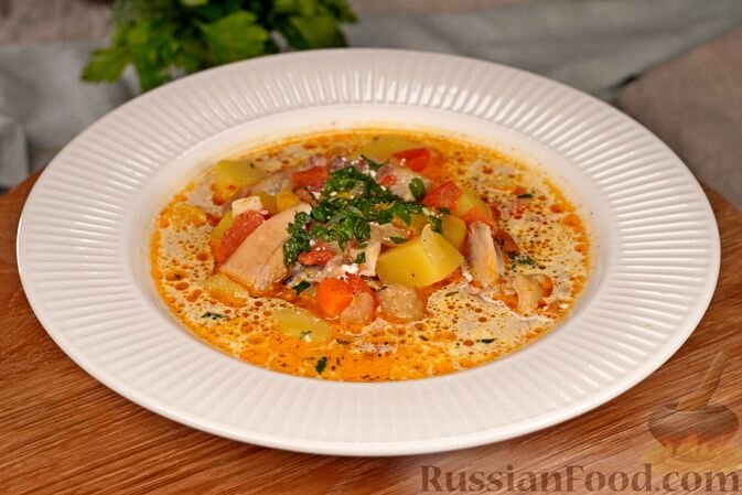 Куриный суп со сметаной. Томатный суп с курицей и рисом. Сырный суп с фрикадельками. Суп с фрикадельками и блинчиками. Овощной суп с сырными шариками. Суп с фасолью и щавелем. Сырный суп с куриным филе и кукурузой. Томатный суп с курицей, рисом и сладким перцем. Куриное филе нарезается кусочками и варится быстро. Рис варится вместе с картофелем в бульоне. Лук, морковь и перец обжариваются вместе с измельчёнными помидорами и томатным пюре. Затем всё соединяется в кастрюле, и суп варится несколько минут до готовности. Сырный суп с фрикадельками и овощами. Добавлением плавленого сыра делает суп нежнее и вкуснее. Фрикадельки из мясного фарша ускоряют приготовление первого блюда, по сравнению с супами на бульоне, и придают аппетитность и сытность. Суп с фрикадельками и лапшой из блинчиков. Интересный суп, в составе которого только фрикадельки из фарша, обжаренные лук с морковью и нарезанные лапшой тонкие блинчики на молоке, а также свежая зелень. Овощной суп с сырными шариками. Овощи, в то