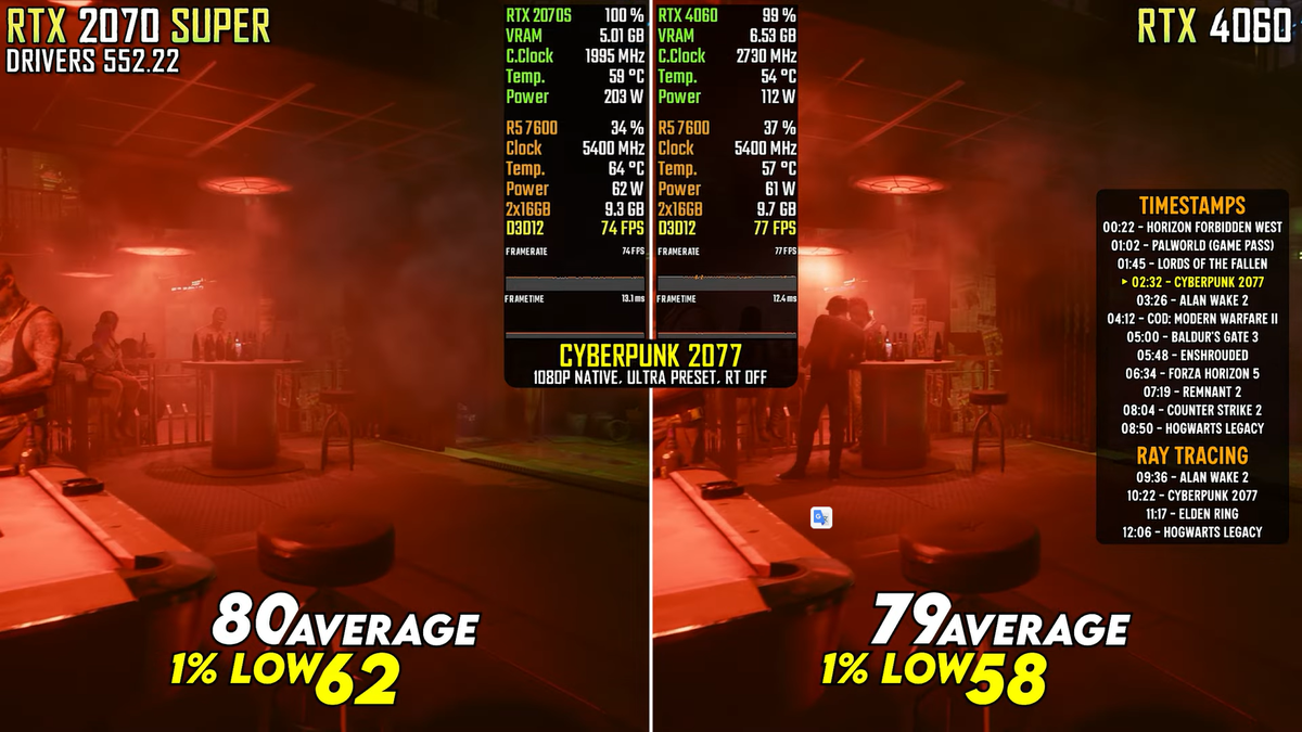 В одном из выпусков на YouTube-канале NJ Tech выяснили, какой производительности стоит ждать от RTX 2070 S и RTX 4060 сейчас в играх. Horizon Forbidden West шла с пресетом Very High, TAA. Средняя частота кадров в этой игре равнялась 64 (RTX 2070 Super) и 68 (RTX 4060). Palworld тестировалась с пресетом Epic, TSR. В среднем в ней производительность находилась на уровне 75 к/с (RTX 2070 S) и 84 к/с (RTX 4060). Lords of the Fallen запускалась с ультра-пресетом. В среднем FPS в этой игре составлял 58 к/с (RTX 2070 S) и 65 к/с (RTX 4060). В игре Cyberpunk 2077 с графикой Ultra, RT Off средняя частота кадров составляла 80 к/с (RTX 2070 S) и 79 к/с (RTX 4060), с RT — 48 и 64 к/с соответственно. Игра Alan Wake 2 шла с DLAA, пресетом High, RT Off. Средняя производительность равнялась в ней 45 к/с (RTX 2070 S) и 48 к/с (RTX 4060). С Ray Tracing частота кадров составляла 21 и 35 к/с соответственно. COD: Modern Warfare II тестировалась на настройках графики Ultra, SMAA Normal. В среднем здесь FPS