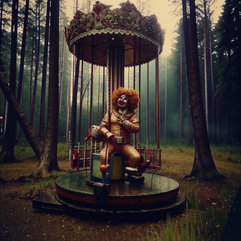Встреча в лесу Был теплый летний вечер. Солнце медленно опускалось за горизонт, окрашивая небо в мягкие оттенки розового и оранжевого. Легкий ветерок шелестел листьями деревьев, создавая приятную мелодию природы. Алексей шел по лесной тропе, наслаждаясь тишиной и спокойствием. Он часто приходил сюда, чтобы отдохнуть от городской суеты и насладиться красотами природы. Сегодняшний вечер не был исключением. Вдруг Алексей услышал смех. Сначала он подумал, что это просто игра воображения, но смех становился все громче и отчетливее. Он остановился и прислушался. Смех раздавался откуда-то справа от тропы. Любопытство взяло верх над Алексеем, и он свернул с тропы, направляясь в сторону смеха. Через несколько минут он вышел на небольшую поляну. На краю поляны стоял маленький деревянный домик, а рядом с ним – старая, ржавая карусель. Алексей подошел ближе и увидел, что на карусели сидит клоун. Его лицо было покрыто толстым слоем грима, а на голове торчали ярко-рыжие волосы. Клоун весело с
