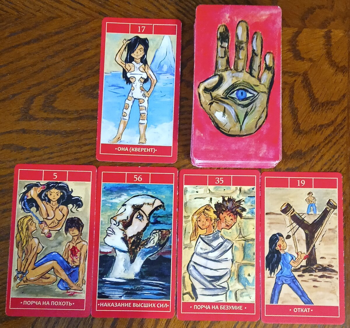 Вышли карты: "Порча на похоть", "Наказание Высших Сил", "Порча на безумие", "Откат". Рассмотрим, как живёт Ваш враг и какое получает наказание от Высших Сил? "Порча на похоть" - порча на блуд - это разновидность негативного магического воздействия, при котором жертва ( в данном случае Ваш враг) испытывает постоянное влечение к сексу, при этом, данная тяга ни коим образом не может быть утолена. Делается эта порча из-за мести или ревности. В первую очередь это влияет на здоровье, помутнение в голове, так как Ваш враг плохо понимает, что она делает и различные гинекологические заболевания вплоть до серьёзных операций. "Наказание Высших Сил" - наказывают Высшие Силы чаще всего людей, которые ведут праздный образ жизни и людей, которые занимаются магией и приносят вред, у таких людей нет души. Сложности этим людям даются для осознания своих ошибок. "Порча на безумие" - это очень сильный вид порчи, для того, чтобы Ваш враг сошла с ума. Это действует как проклятье. Как правило, этот вид испол