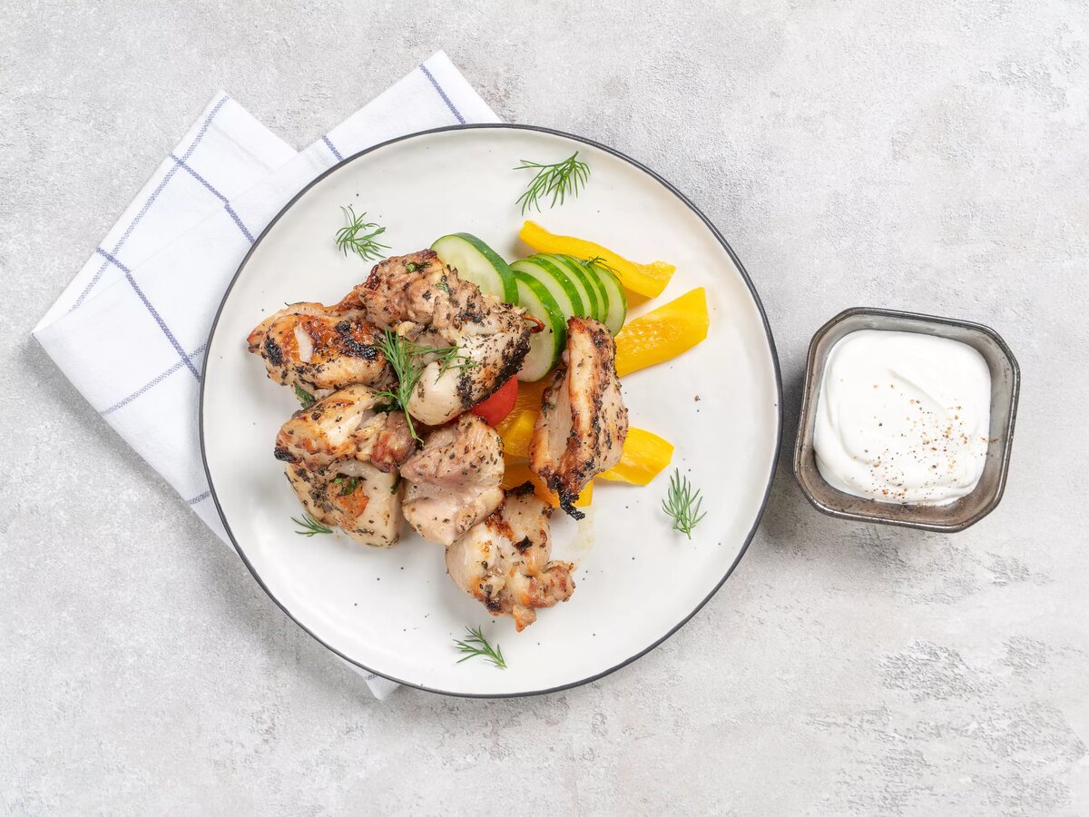 Шашлык из куриных окорочков — это сочетание нежных кусочков мяса и ароматных специй, которые придают блюду неповторимый вкус. Замаринованные куриные окорочка, нарезанные на кусочки и нанизанные на шампуры, обжариваются на открытом огне до золотистой корочки, сохраняя свою сочность и мягкость. Ингредиенты: Приготовление: Подавая шашлык на стол, можно украсить его свежими овощами, зеленью и соусом на основе йогурта. Это добавит ярких красок и насыщенности вкусу. Приятного аппетита!