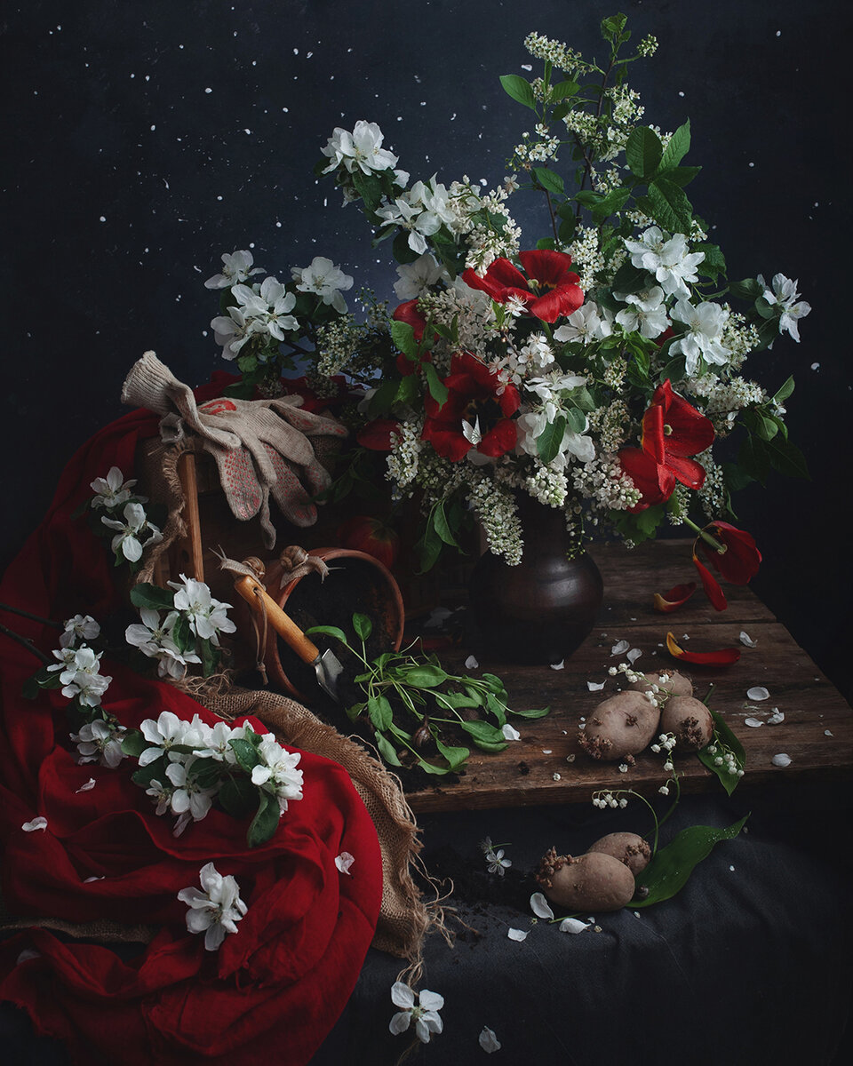Первая гроза, пышное цветение и блеск молодой зелени, тёплые ночи и длинные прогулки, пение птиц и сладкий воздух, посадки и праздники - всё это май, красочный предвестник лета. Май получился у меня уж очень магический. Сочетание синих и красных оттенков в полумраке переносят меня в состояние неги. Возможно, это и хорошо, ведь в мае все мы немного вдохновлены и с упоением ждем прихода лета. Работа над этим месяцем была не столь мучительна как над предыдущими, картинка пришла быстро и реализовалась с первой попытки. Здесь я собрала, по моему мнению, главные атрибуты месяца. Ветки цветущих в мае деревьев-черемуха, яблоня, вишня и сирень(сирень только взяла белую, тк классическая сюда по цвету не очень вписывалась), красные тюльпаны( одни из самых распространенных первых цветов в мае и как символ Дня Победы-их здесь 9 штук. Может кто-то скажет, что цветок победы это гвоздика, но в моем детстве мы всегда поздравляли ветеранов именно красными тюльпанами, тк это первые цветы, появлявшиеся в