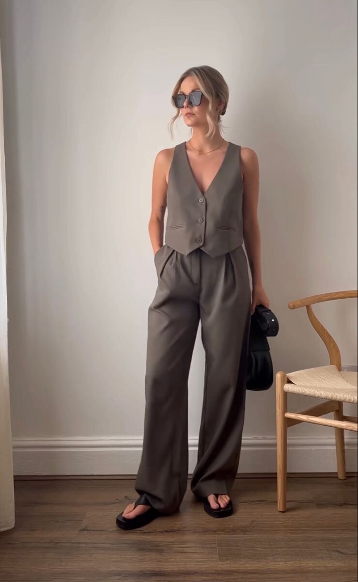 За пределами офиса: стильные идеи, с чем носить костюмный жилет летом 2024 года Костюмный жилет - это универсальная вещь, которая может превратить любой образ в более респектабельный и формальный. Хотя традиционно он ассоциируется с офисным стилем и строгостью, есть множество способов носить его повседневно и выглядеть при этом свежо и стильно. В этом году, летом 2024, подробно рассмотрим, с чем носить костюмный жилет. 1. Костюм (тройка или двойка, с юбкой или брюками) Просто и элегантно. Подумайте о тройке: костюме, состоящем из пиджака, жилета и брюк или юбки. Носите его с простой, изящной блузой для безупречного делового стиля. Независимо от того, предпочитаете вы строгие брюки или элегантные юбки, эта комбинация дает бесконечное количество вариантов для создания стильного образа. 2. Идеальный вариант для многослойности (с футболкой или блузкой, лонгсливом или рубашкой) Костюмный жилет отлично подходит для слоевых образов. Наденьте его поверх футболки или блузки, добавьте л