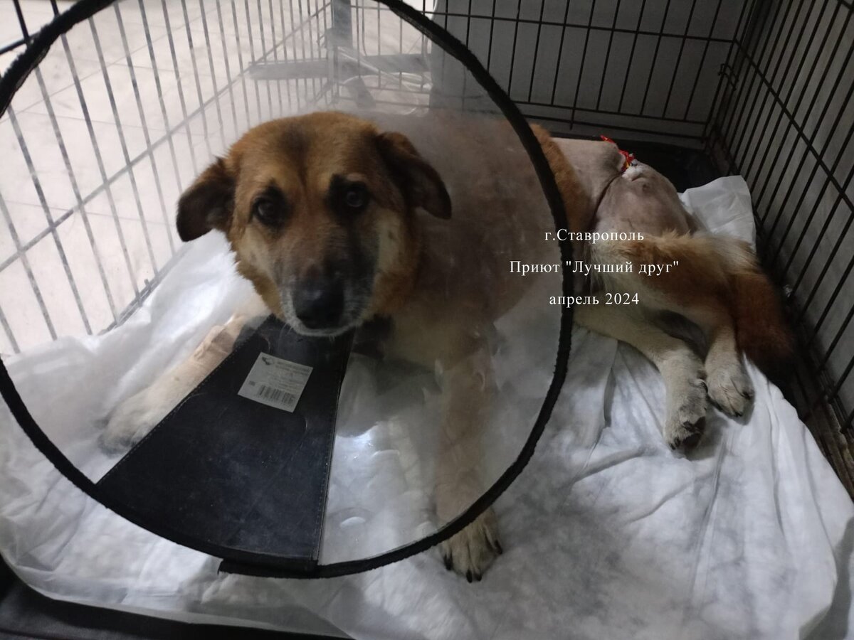 Афину 19 апреля выписали из клиники долечиваться в приют. Дважды рыжая красавица еще посещала клинику, ей сняли дренажи из раны, зачищали рану и накладывали швы. Тяжело идет заживление, слишком большая область поражения. А Афина терпит все манипуляции, уколы, обработки, только виляет тихонечко хвостом. Афина - собака возрастная, ей 7-8 лет, мордочка седая, части зубов нет, милая собака, которая пострадала ни за что... Жила стерилизованная и привитая собака больше двух лет на одном месте, внизу улицы Полевой, со всеми дружила, ее подкармливали, а она в благодарность утром ходила провожать местных жителей на работу до поворота, а вечером играла с детьми. Тихая размеренная жизнь у нее закончилась в тот момент, когда у владельца теплиц сорвался его алабай и покусал беззащитную собаку. Собака в шоке забилась в глухом месте, потом ее достали люди, несколько дней обрабатывали на месте, но раны слишком глубокие, без хирурга не справится, отвезли собаку в клинику.