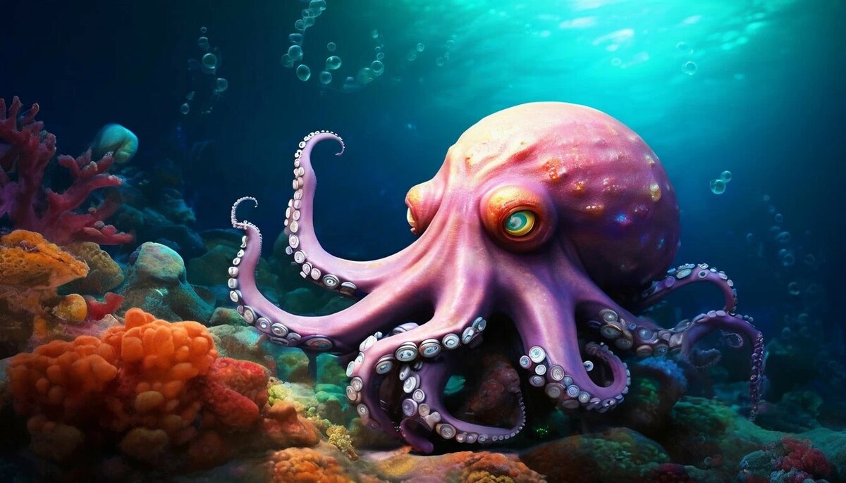 В глубинах бескрайнего океана, где солнечный свет едва проникал, скрывался таинственный мир, полный удивительных существ. Жил-был любопытный осьминог по имени Октавиус. У него было восемь длинных щупалец, которые он использовал для исследования морского дна. Однажды, когда Октавиус плавал среди коралловых рифов, он заметил мерцающий свет. Подойдя ближе, он увидел огромную раковину, украшенную драгоценными камнями. Октавиус осторожно открыл ее и обнаружил внутри прекрасную жемчужину. Но как только он прикоснулся к ней, раковина захлопнулась, и Октавиус оказался в ловушке. Внезапно, из темноты выплыла стая светящихся медуз. Их щупальца были покрыты крошечными огоньками, которые освещали путь. Медузы окружили Октавиуса и повели его к подводному городу. Город был высечен из кораллов и ракушек. В нем жили морские коньки, морские звезды и другие удивительные существа. Октавиус был поражен их красотой и разнообразием. В центре города стоял величественный дворец, сделанный из сверкающего