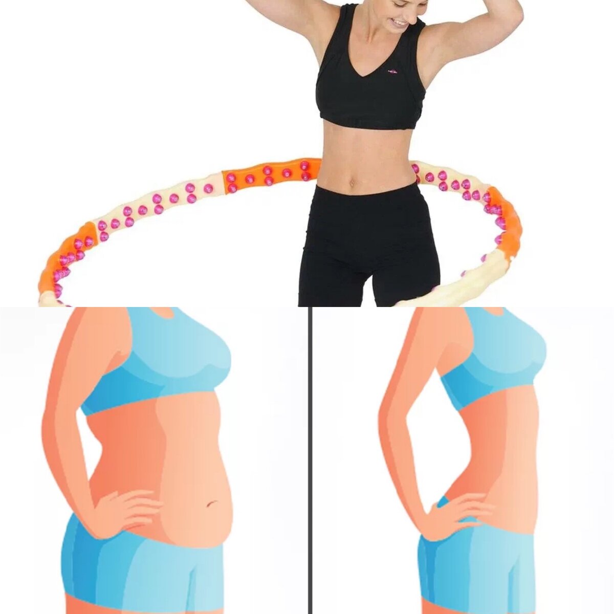 Также работа с обручем помогает улучшать работу пищеварения, так как оказывает своего рода массажный эффект. Да и сам обруч хорошо прорабатывает бока и талию, укрепляя косые мышц живота.