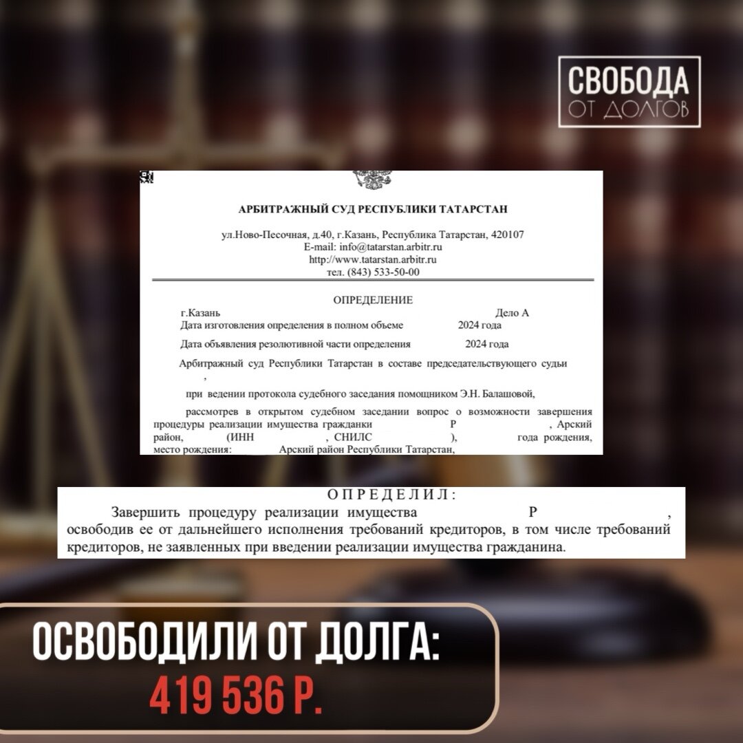Если вы хотите узнать, есть ли у вас шанс на законное списание долгов, пройдите бесплатный ТЕСТ. Р. из Республики Татарстан. ❗️ Размер списанного долга: 419 536 руб. Имущественное положение: имущества и официального дохода нет. Не смотря на отсутствие официального дохода, клиентка часто пользовалась кредитными картами, погасить долг по которым, конечно же, было нечем. Как итог - не справилась с долговой нагрузкой и решила пройти процедуру банкротства. ☝🏻 Судом сразу была введена процедура реализации, дополнительных документов запрошено не было. Процедура длилась по времени 7 месяцев. Итог: ДОЛГИ СПИСАНЫ!👏 💡 Что делать прямо сейчас?