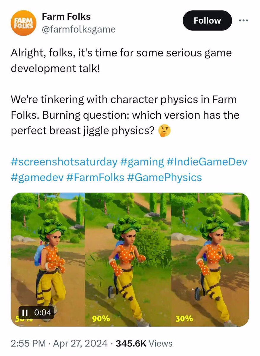 Разработчики казуального симулятора фермы Farm Folks из студии Crytivo решили присоединиться к хайпу, созданному вокруг экшена Stellar Blade, но не учли особенности своей аудитории. Пусть игра еще не вышла в релиз, но уже понятно, для кого она создается. Ядром аудитории подобных игр являются женщины, и женщины эти нервные. Команда решила пошутить в социальной сети X, выложив ролик с демонстрацией трех моделей персонажа, ассоциирующего себя с женщиной, предложив выбрать игрокам одну из трех версий настроек физики женской груди. И тут началось! Сперва пришли геймеры-мужчины и похвалили команду за идею. А раз пошло внимание, то неудивительно, что видео стало достоянием игровой общественности. Тут же набежала орда активисток всех калибров и начали отменять и хейтить разработчиков. В итоге Crytivo пришлось удалить неудачный твит и опубликовать огромную простыню с извинениями. Есть мнение, что после такой провалившейся шутки у “тела номер 2” вообще не будет вторичных половых признаков, чтобы