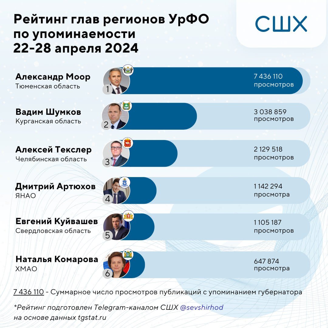 Первое место продолжает удерживать губернатор Тюменской области Александр Моор с 7 436 110 просмотрами и 1 562 публикациями. На втором — все так же губернатор Курганской области Вадим Шумков с 3 038 859 просмотрами и 590 публикациями. Главная тема для обоих — паводок, на фоне которого главы снова по ВКС встретились с Владимиром Путиным.