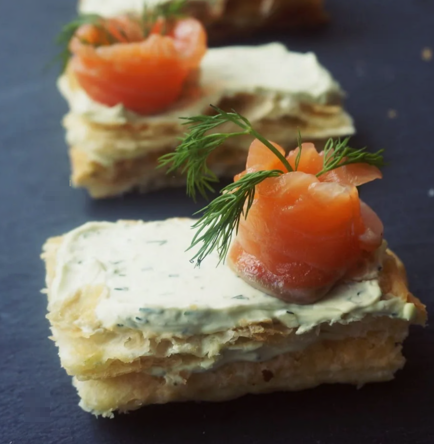 Мильфей с семгой — это многослойный салат, состоящий из ржаных хлебцев, творожного сыра, базилика, семги холодного копчения, свежего огурца и зеленого лука. Хлебцы смазывают творожным сыром, выкладывают на них нарезанные ингредиенты и украшают зеленью. Ингредиенты для салата «Мильфей» с сёмгой (для одной порции) Этапы приготовления Калорийность этого салата составляет 29 ккал на 100 грамм продукта. В одной порции (200 грамм) содержится 57 ккал. Белки — 1,87 грамма, жиры — 2,27 грамма, углеводы — 7,27 грамма.
