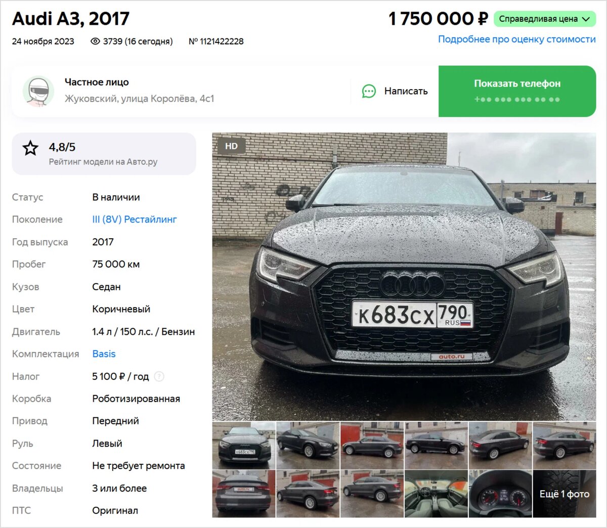 Держа в уме вышесказанное, открываем Отчёт Авто.ру. За свою совсем короткую жизнь A3 продаётся на Авто.ру уже пятый раз. А предыдущее размещение было в апреле 2022 года, то есть всего за год и семь месяцев до публикации актуального объявления. Выглядела четырёхдверка примерно так же, но пробег был на 25 тысяч километров меньше, а цена составляла 1,25 миллиона рублей.