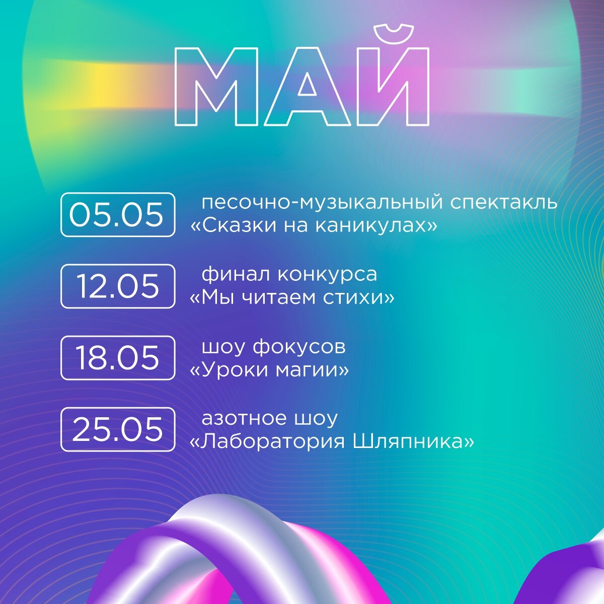В мае посетителей торгового центра «Муравей» ждёт много всего интересного! 5 мая на сцене торгового центра в 13:00 покажут невероятное песочно-музыкальное шоу «Сказки на каникулах». Каникулы летом ‒ время отсыпаться, купаться и веселиться. Время восстанавливать силы. Но Министерство Улучшений в стране Сказок решило проверить ‒ нужны ли они. Для проверки был отправлен ответственный специалист ‒ Зануда. Ещё немного и он бы запретил каникулы, но главные герои ‒ Чебурашка, Крокодил Гена, Баба Яга, Красная Шапочка и Доктор Айболит ‒ придумали план как спасти каникулы от запрета. Скрипичный квартет попутно познакомит юных слушателей с классической русской музыкой. 12 мая состоится финал традиционного видеоконкурса «Мы читаем стихи». Работы принимаются до 3 мая в официальной группе ВКонтакте. Подарки ждут всех участников конкурса. В этот день помимо награждения состоится выступление нижегородских танцевальных коллективов и вокальных ансамблей. Мероприятие состоится в 13:00. 18 мая юные посети