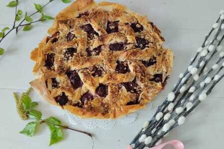 В Пасхальный день у нас столы ломаются от изобилия: кулич, пасха, яйца, всевозможные пироги, мясо и много всякой вкусной еды. Ни один праздничный стол не обходится без пирогов. Вашему вниманию представляется вкуснейший пирог с вишневой начинкой и хрустящей ореховой корочкой. Готовится несложно, а результат- потрясающий! Этот рецепт принимает участие в Пасхальном конкурсе с ценными призами нашего сайта koolinar.ru, присоединяйтесь! Ингредиенты Приготовление 1. Разморозить тесто фило. Форму для выпечки диаметром 22-24 см выложить пергаментом. Кокосовое масло растопить. Форму выложить 2 слоями тесто фило, крест накрест, смазать кокосовым маслом, посыпать двумя видами сахара. 2. 2-3 слоя теста фило скомкать и выложить им дно пирога, смазать растопленным кокосовым маслом и посыпать двумя видами сахара. 3. Посыпать 1/2 крахмала, выложить свежемороженную вишню (не размораживать), посыпать оставшимся и двумя видами сахара. 4. Для "решетки" сложить слой теста фило пополам, по длине нарезать на