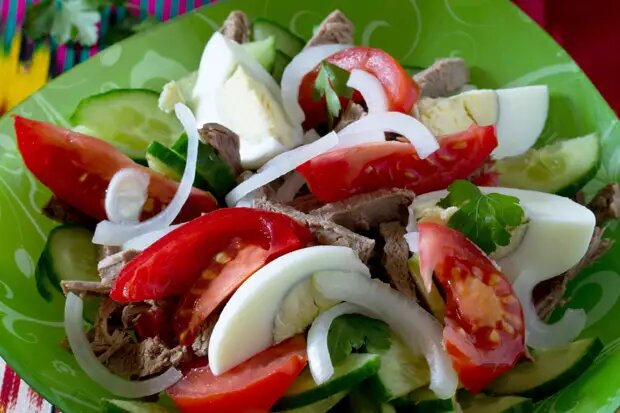 Хорошее дело - заниматься разборами старых журналов! Снова нашла интересный рецепт, который одновременно очень прост в исполнении и вкусен. У меня был журнальчик с салатами со всего мира. Мне приглянулся салат из Узбекистана. "Бахор" замечательный белковый холодный салат. Здесь есть всё, что нужно в жаркую погоду - много овощей и зелень. А ещё есть мясо. Для моей кухни - редкость: говядина. Поэтому и салат получается на мой вкус очень даже хорош. Сегодня нам понадобится следующий набор продуктов: -говядина отварная - 200 гр -розовые томаты - 2 шт достаточно крупные -свежие огурцы - 2 шт среднего размера -репчатый лук - 1 средняя луковица -яйцо куриное - 2 шт -пучок петрушки, соль, чёрный молотый перец -сметана - 75 гр Приготовление: 1. Отварную говядину порезать тонкими брусочками 2. Помидоры и огурцы нарезать кусочками среднего размера 3. Лук нарезать тонкими полукольцами. 4. Яйца отварить, порезать крупно: на 4 части 5. Измельчить петрушку. 6. Самое главное! - сложить всё в салатни