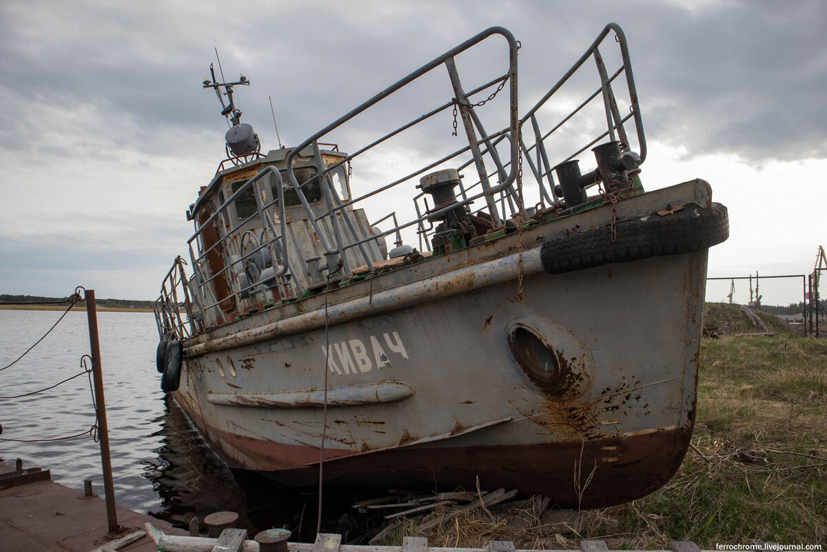 Во время поездки в дали дальние, мы в очередной раз нашли брошенный буксир, на этот раз крупнее предыдущих и в лучшем состоянии. Но так же, как и другие, он оставлен на вечном приколе, и обречён на съедение коррозией. В начале мы, подъехав к небольшой стоянке вполне себе действующих новых кораблей, обнаружили одиноко стоявший, съеденный ржавчиной и уже умерший кораблик. Рядом вечным сном спало это. А через забор, на территории небольшого порта, мы увидели судно поинтереснее. И отправились его исследовать. "Кивач", тип БКТ (Бурлак). В рубке. Штурвал, как всегда, снят. Взглянули с палубы через люк на двигатель. А после спустились к нему. Все машинное отделение было затоплено мазутом, под тяжестью которого корабль накренился. На этом мы завершили осмотр данного плавсредства.