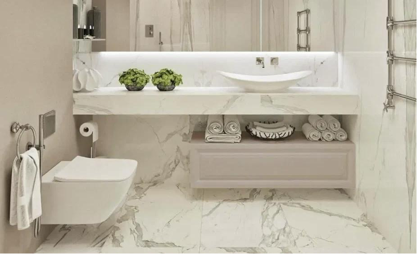 - Смешение различных фактур — это отличный способ преобразить и сделать индивидуальной нейтральную обстановку, особенно если она монохромная. Этот прием может быть использован в любой комнате, начиная от гостиной и заканчивая спальней. Но в ванной комнате он особенно эффективен. Вы можете экспериментировать с отделкой и мебелью, вводя разнообразные текстуры, такие как мрамор, дерево, металл, натуральный камень, стекло и терраццо.Мрамор — придает ванной комнате элегантность и роскошь.