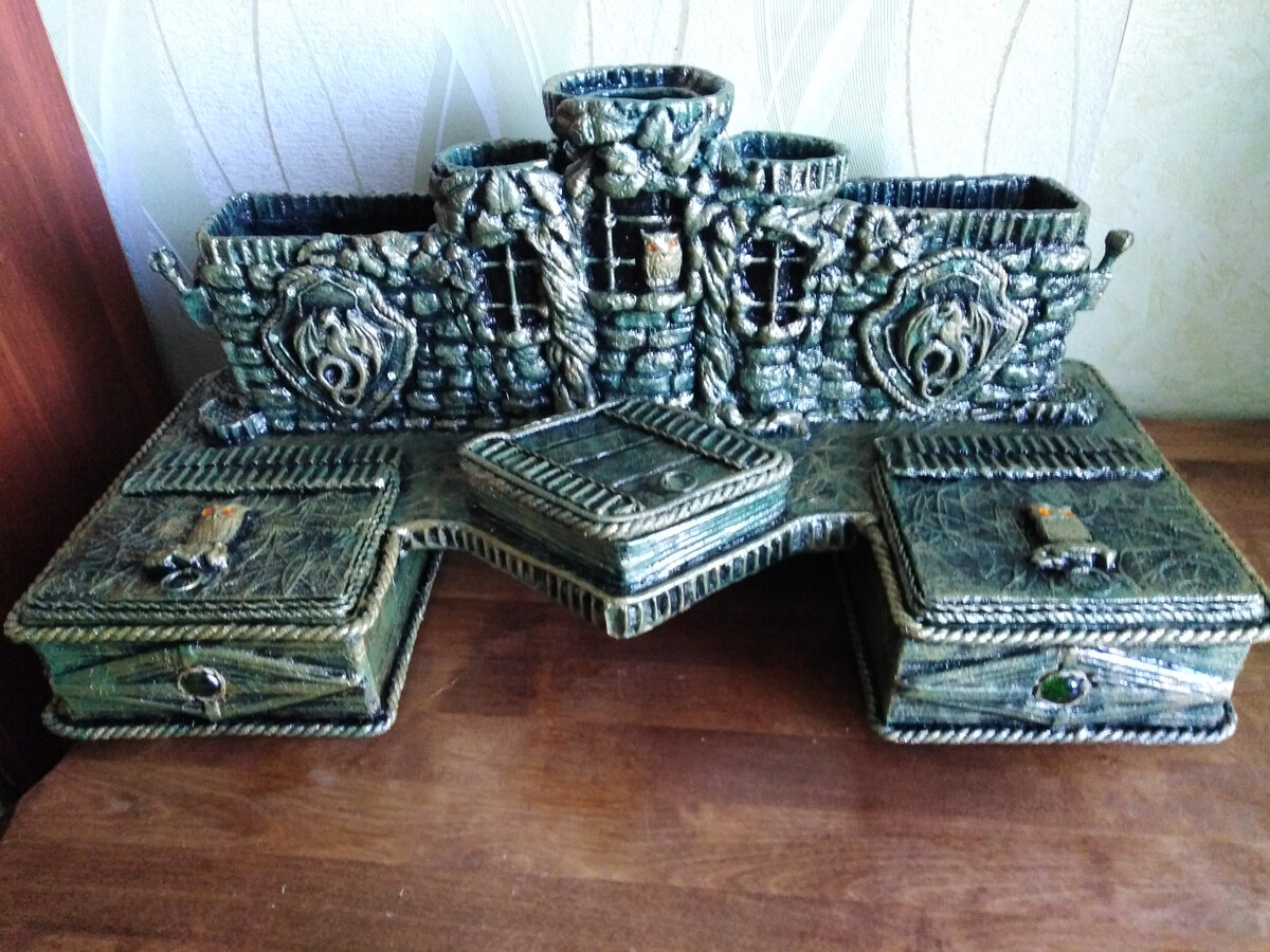 Итак, сегодня ещё один настольный органайзер с имитацией позолоченная медь. Верхняя часть - для ручек, карандашей, линеек. По бокам - большие ящички - для бумаги, блокнотов. Середина - ящичек для канцелярских мелочей. Если предыдущий органайзер был сине-черно-серебристый, то эта работа выполнена в черно-зелено-золотистых тонах. Да и форма этого органайзера уже другая - я не люблю повторяться, каждая вещь, даже если это какой-то один предмет, всё равно будет другой, непохожей, со своим "лицом". Основа - гофрокартон. Если тонкий, то в два или три слоя склеить полимерным клеем. Сделать нижнее основание. Склеить верхнюю часть с нижней боковыми стенками ящичков. На верхней части из картона сделать средний ящичек. Всё обклеить салфетками клеем ПВА+вода.