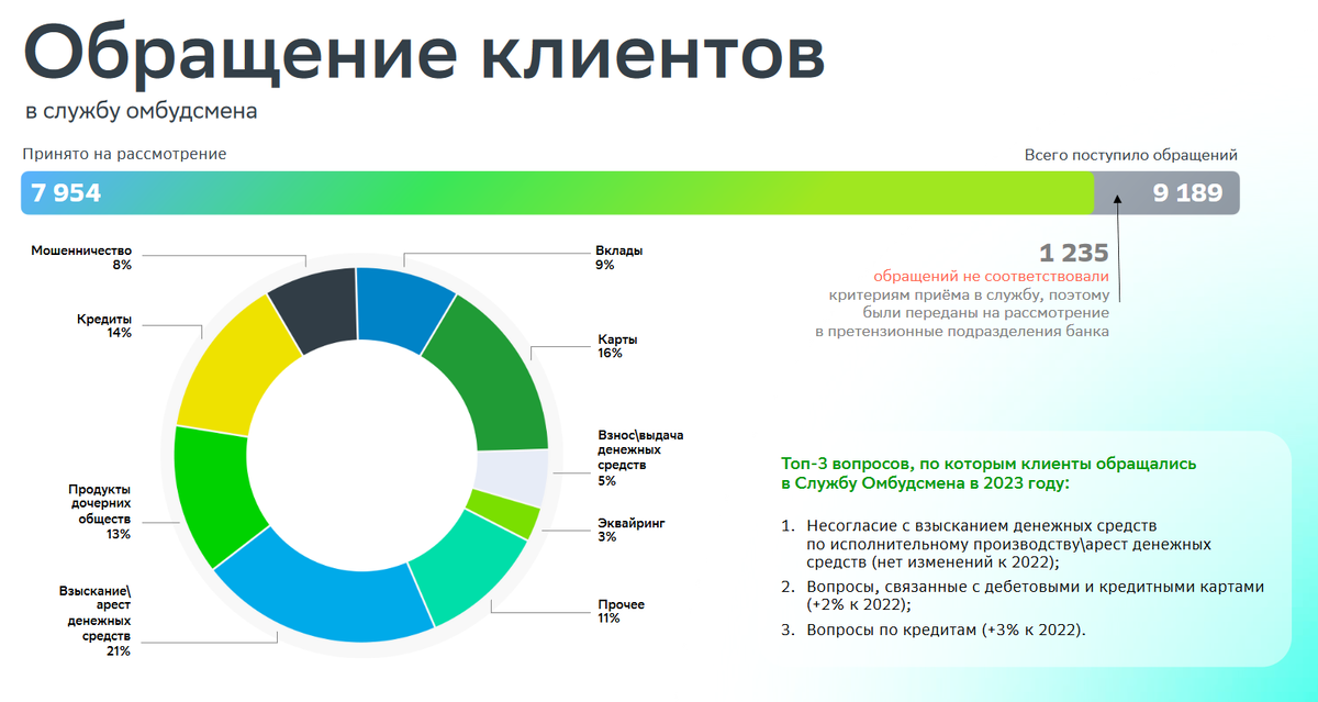Согласно отчету службы за 2023 год к ним поступило 9189 обращений. По 25% из них банк пересмотрел предыдущее решение! Именно поэтому я говорю о том, что обращение к Омбудсмену Сбербанка может стать достойной альтернативой подаче искового заявления в суд. Во-первых, потому что клиенту не придется тратить время и деньги на подготовку комплекта документов и оплату госпошлины. Во-вторых, результата можно добиться быстрее — средний срок рассмотрения обращений составляет всего 10 рабочих дней. К тому же судебная практика показывает, что решения Омбудсмена оспариваются очень редко, менее чем в 1% случаев.
