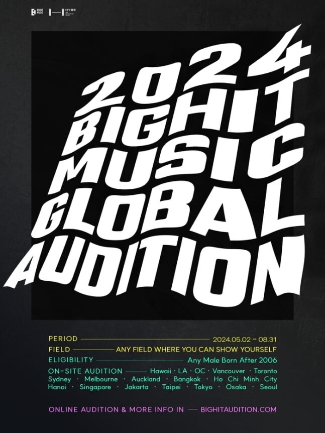 2 мая агентство сообщило в своем официальном веб-сайте о предстоящем прослушивании «2024 BIGHIT MUSIC GLOBAL AUDITION». В нем могут участвовать мужчины, родившиеся в 2006 году или позже, во всех формах и без каких-либо ограничений в областях/сферах/направлениях.