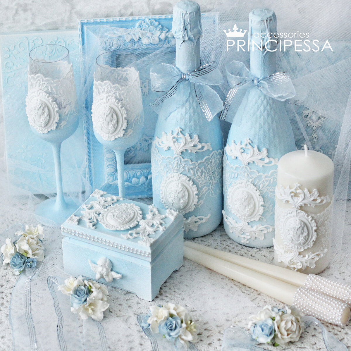 В набор входило: -шкатулка для колец -свадебные свечи -бутылки шампанского -бокалы Шкатулка для колец с инициалами На крышке шкатулки лепнина ручной работы Браслетики подружкам невесты с цветами (Таиланд) на ленте из органзы Свечи с лепниной и жемчужной тесьмой Свадебное шампанское и бокалы загрунтованы и окрашены вручную Украшены кружевом и бантами из органзы Свадебные бокалы с камеями и кружевом На бор был выполнен на заказ / без повтора / нет в наличии / без повтора ______________________________ Мои другие источники, где я делюсь своим творчеством: Instagram: https://www.instagram.com/solis.iness Ярмарка мастеров: https://www.livemaster.ru/principessa-si Вконтакте: https://vk.com/solis_iness Telegram: https://t.me/solis_iness Pinterest: https://ru.pinterest.com/solis_iness Boosty.to: https://boosty.to/solis.iness You Tube: https://www.youtube.com/c/PRINCIPESSAaccessories