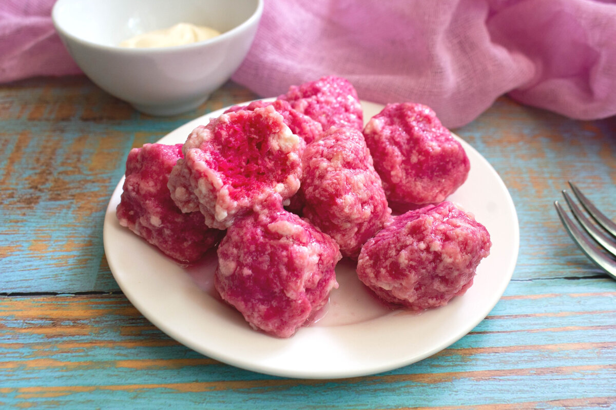 Любите ленивые вареники? Попробуйте приготовить их и по этому рецепту тоже. Вареники получаются очень яркие, вкусные и красивые, они заинтересуют своим красочным видом даже детвору. Свекла в варениках не сильно чувствуется, зато добавляет этот замечательный цвет. Готовить такие вареники просто, как и классические ленивые вареники. Продукты для приготовления нужны самые простые. Ингредиенты: Творог - 250 г. Свекла - 80-100 г. Сахар - 1 ст.л. Сахар ванильный - 1 ч.л. Соль - щепотка Яйцо куриное - 1 шт. Мука - 100 г. Для варки: Вода - 2 л. Масло растительное - 1 ст.л. Нам понадобится вареная свекла, варим ее до мягкости, остудим и почистим. Затем свеклу натираем через мелкую терку. Добавляем в чашку мягкий творог. Если вы хотите очень нежные вареники, то второго можно перетереть через сито. Вобьем в чашку яйцо. Добавим в чашку соль, ванильный сахар и сахар. Перемешиваем массу до растворения сахара. С этим количеством сахара вареники будут в меру сладкие, так что, если вы любите более слад