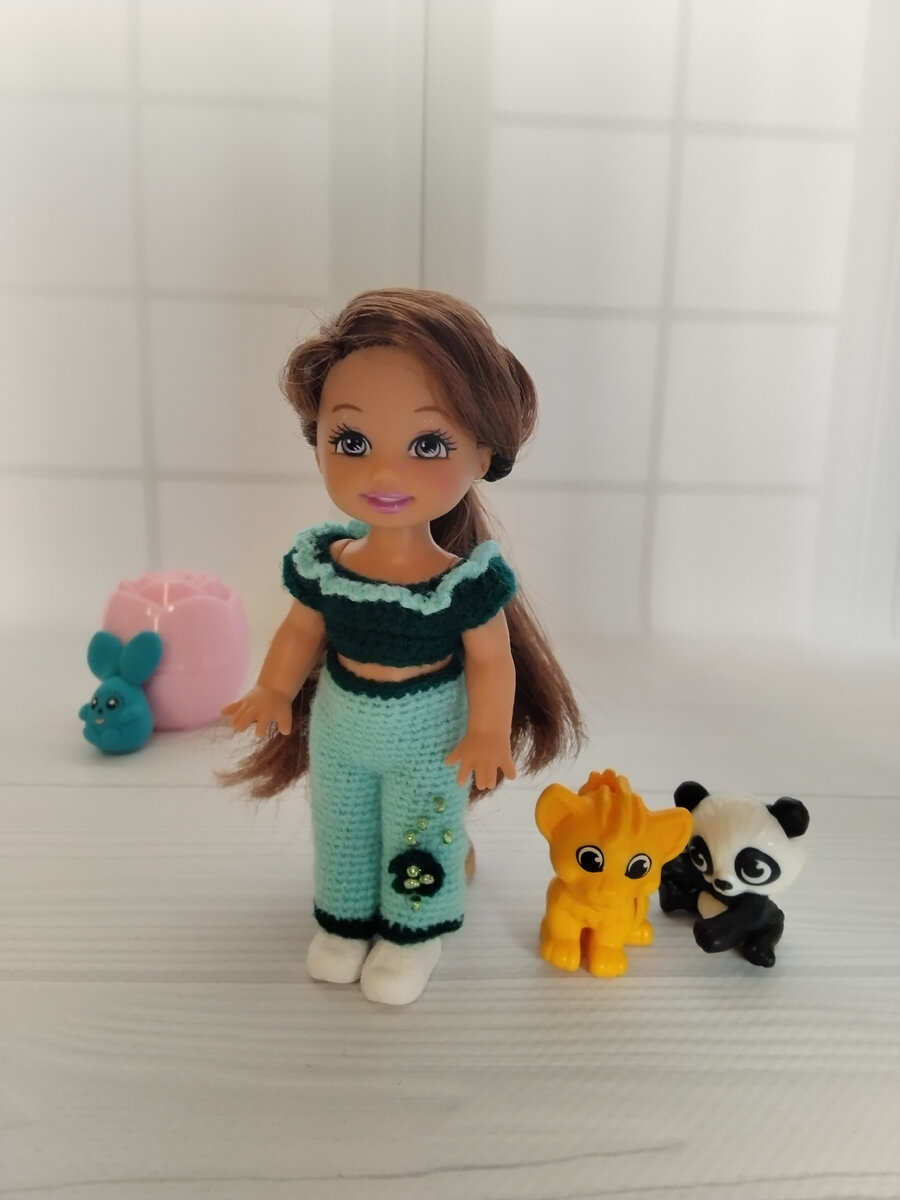 Ниточки - акрил для вышивания. Кофточка. Зелёная нить. Косичка из 40 в.п. 1 ряд: ст.б.н. 2 ряд: вяжем весь ряд за переднюю стенку, чередуем: в первую петлю провязываем столбик с накидом, во вторую - два столбика с накидом. 3 ряд: 58 ст.б.н. 4 ряд: 7 ст.б.н., 2 в.п., пропускаем 15 петель, 14 ст.б.н., 2 в.п., пропускаем 15 петель, 7 ст.б.н. 5 ряд: ст.б.н. Бирюзовая нить. Во втором ряду остались дольки для оборочки. В каждую петельку провязываем столбик без накида и 2 воздушные петли. Сзади пришиваем кнопочку. Штанишки. Бирюзовая нить. Цепочка из 30 в.п., замыкаем в кольцо. 4 ряда провязываем столбиками без накида. 5 ряд: (5 ст.б.н., прибавка)* 7 рядов по кругу столбиками без накида. Провязываем 3 в.п. - перемычка между ножками, соединяем петлей на противоположной стороне, и продолжаем вязать по кругу первую штанинку 22 ст.б.н. - это 19 ст.б.н. + 3 петли перемычки. И вяжем 16 рядов. Последний ряд зелёной нитью. Аналогично вторую штанинку. По поясу обвязываем зеленой нитью столбиками без