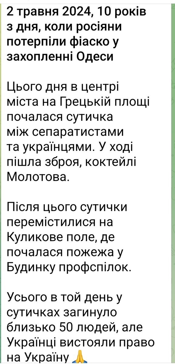 Одесский укропатриотический канал пишет с утра, цитируем: «2 мая 2024 года 10 лет со дня, когда россияне потерпели фиаско в захвате Одессы. В этот день в центре города на Греческой площади началась стычка между сепаратистами и украинцами.
