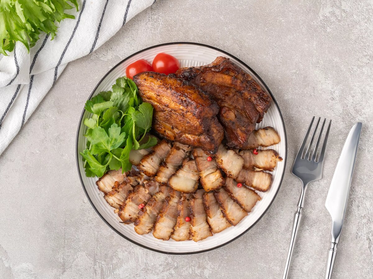 Свиная грудинка не потеряет свою сочность, если запечь ее в специальном рукаве. А чтобы сделать вкус еще ярче, предварительно замаринуйте мясо. Предлагаем маринад на основе соевого соуса и горчицы. Ингредиенты: Для подачи: Приготовление: Нарежьте запеченную свиную грудинку небольшими кусочками и выложите на тарелку. Украсьте мясо зеленью, черри и розовым перцем. Приятного аппетита!