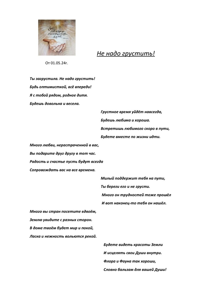 Что-то я в последнее время загрустила. Вот и вчера опять было такое настроение, хотя был праздник 1 мая. Решила обратиться к Иисусу, чтобы передал через меня какое-нибудь послание в стихах и вот что получила от него.
