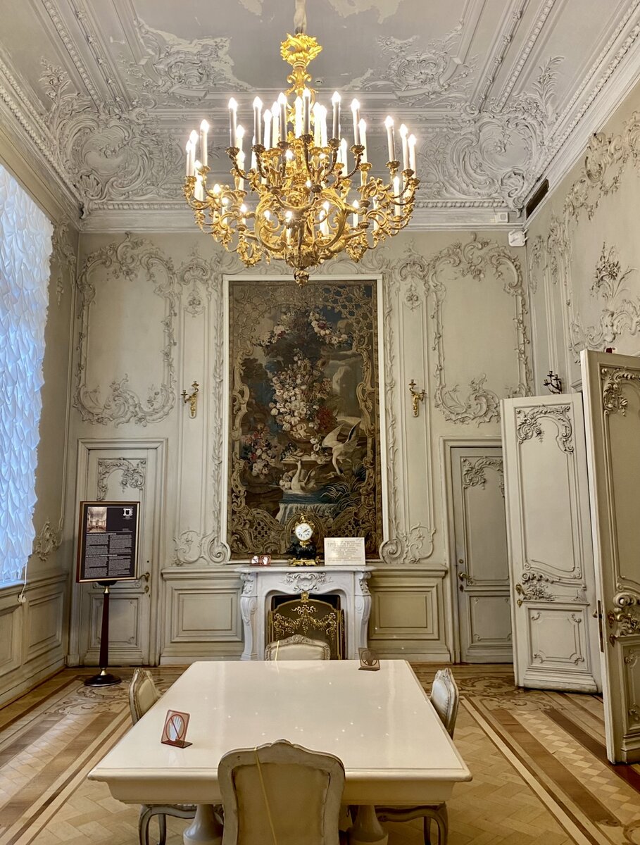 Надо сказать, что интерьеров, специально перестраивавшихся для последнего царствовавшего российского императора в Зимнем дворце практически не сохранилось. После революции, по вполне понятным причинам, именно то, что было связанно с именем Николая Александровича приспосабливалось под музейные нужды первым делом и безжалостно переделывалось, как не имеющее особой «исторической ценности»… В 1894-м созданием интерьеров в «Зимнем» занимался академик архитектуры и архитектор дворца Александр Федорович Красовский. Вообще Александр Федорович довольно бережно относился к реставрации исторических помещений, но иногда, в соответствии со вкусами нового августейшего заказчика, вынужден был поступать откровенно варварски. Допустим он полностью уничтожил оригинальную «Помпейскую столовую» работы Александра Павловича Брюллова и на ее месте построил вот эту довольно блеклую «Малую столовую» стилизованную под поздние вариации рококо. Даже извлеченные из запасников шпалеры восемнадцатого столетия в ко