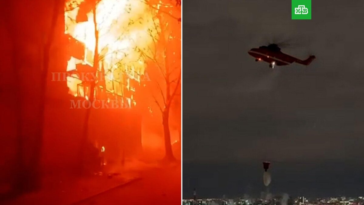 [ Смотреть видео на сайте НТВ ] В пылающем трехэтажном здании на востоке Москвы обрушились конструкции на площади 1 000 квадратных метров. Вертолеты привлекли к тушению пожара в административно-производственном здании на востоке Москвы. Один из них уже сбрасывает воду на горящее здание. Площадь пожара составляет 2,5 тысячи квадратных метров. На площади 1000 метров произошло обрушение. Специалисты почеркнули, что в здании старой постройки возможно дальнейшее обрушение конструкций, пожарные расчеты работают с соблюдением техники безопасности. Также есть угроза распространения огня на соседние здания. В МЧС рассказали, что в тушении пожара задействованы 120 человек личного состава и 35 единиц техники. Информации о пострадавших не поступало. Ранее сообщалось, что административно-производственное здание загорелось на улице Буракова. Огнем охвачены все три этажа. В здании находятся помещения нескольких производственных компаний. По материалам: МЧС. [ Смотреть видео на сайте НТВ ]