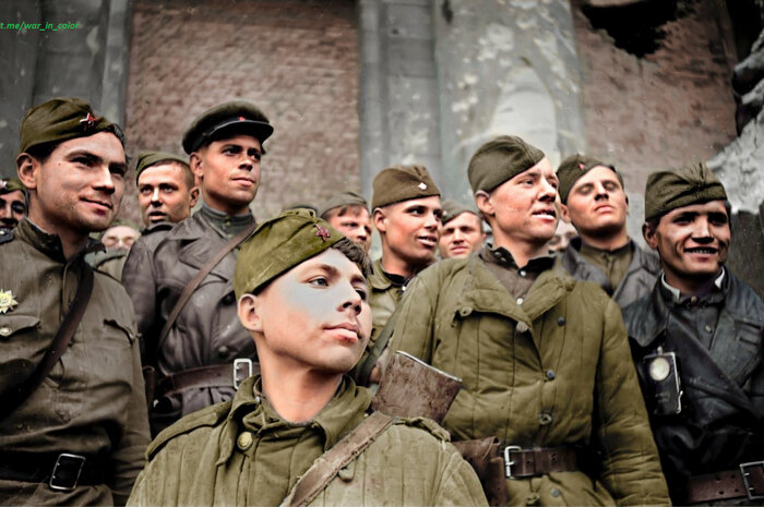 Взвод разведки 674 стрелкового полка 150-й стрелковой Идрицкой дивизии. На переднем плане — рядовой Григорий Булатов. Считается, что именно он первым водрузил красное знамя на Рейхстаге. Однако распространение получила версия, что первыми были ныне знаменитые Михаил Егоров и Мелитон Кантария. За свой подвиг Григорий Булатов был представлен к званию Героя Советского Союза (вместо присвоения этого звания был награжден орденом Красного Знамени). Выдержка из наградного листа: «Краткое описание подвига: …Беря с боя каждый метр площади, в 14 часов 30.4.45 г. ворвались в здание рейхстага, с ходу захватили выход одного из подвалов, заперев там до 300 немецких солдат гарнизона рейхстага. Пробившись на верхний этаж, тов. БУЛАТОВ в группе разведчиков в 14 часов 25 мин. водрузил над рейхстагом Красное Знамя…». Также на фото: в кожаной куртке и фуражке командир взвода лейтенант Семен Сорокин, слева с краю с орденом Отечественной войны сержант Виктор Провоторов, за спиной Булатова (со стороны прикла