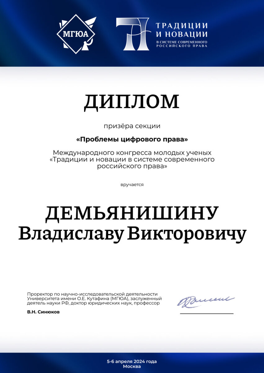5-6 апреля прошел Международный конгресс молодых ученых «Традиции и новации в системе современного российского права», который проходил в рамках XI Московского юридического форума «Формирование многополярного мира: вызова и перспективы». Организаторами Конгресса являются Московский государственный юридический университет имени О.Е. Кутафина, студенческое научное общество Университета имени О.Е. Кутафина, автономная некоммерческая организация «Содружество выпускников МГЮА (Университета имени О.Е. Кутафина)». Конгресс объединил более 1400 участников — студентов, аспирантов и молодых ученых из 55 образовательных организаций России. На конкурс научно-исследовательских работ было направлено 109 исследований. На протяжении двух дней в различных форматах проходили обсуждения правовых вопросов в рамках 51 секции. Студент 2 курса юридического факультета Донецкого государственного университета Демьянишин Владислав получил диплом призера секции «Проблемы цифрового права». Тема научного доклада: «