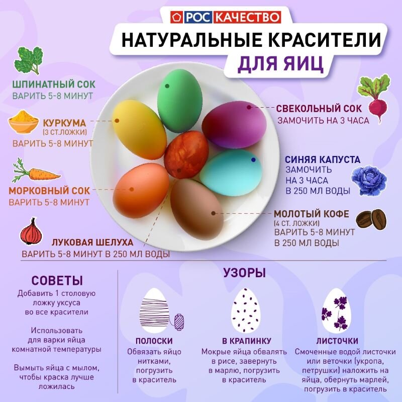 Главный внештатный диетолог Минздрава России Виктор Тутельян рассказал о куриных яйцах и полезных веществах, которые они содержат. В яйцах содержатся важные аминокислоты, жирорастворимые витамины и холестерин. Поэтому будет вполне достаточно двух яиц — они здоровью не повредят. А вот использование ненатуральных красителей при окрашивании яиц может вызвать аллергическую реакцию. Чтобы ее избежать, лучше пользоваться природными и безопасными красителями — луковой шелухой, свеклой или краснокочанной капустой. Важно придерживаться разумного потребления традиционных пасхальных блюд. Это позволит организму получить множество ценных белков, легче перейти с постного меню на мясоедческое. А вот как покрасить яйца с помощью натуральных красителей рассказали в Роскачестве. В качестве красителя специалисты советуют использовать шпинатный, свекольный и морковный соки, синюю капусту, луковую шелуху, куркуму и пр. Материал на сайте «маленькая Сызрань»