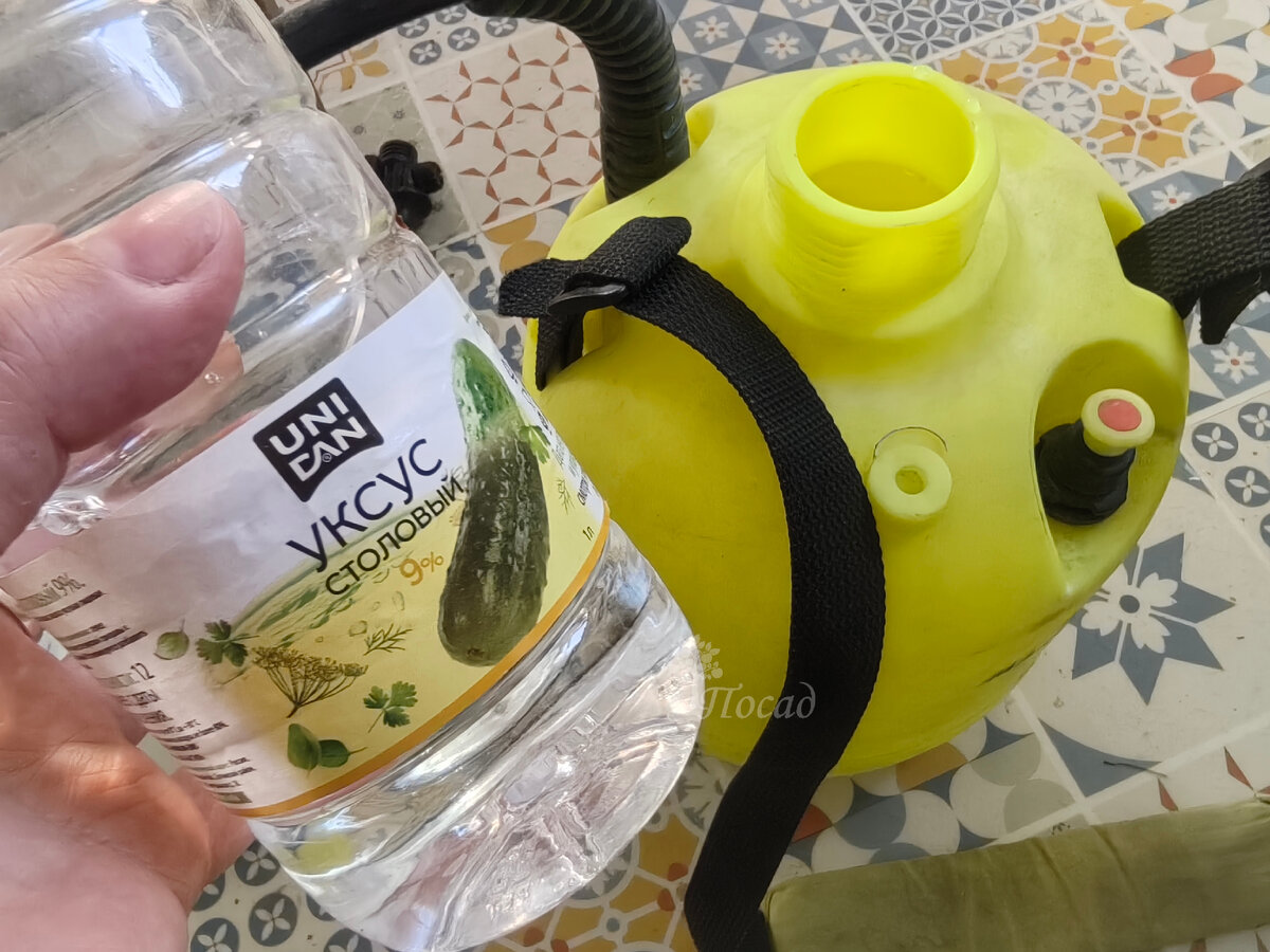 Я подкисляю воду обычным столовым уксусом, самым дешёвым. Один раз я высчитала, сколько примерно мне нужно уксуса на бак опрыскивателя и теперь просто добавляю это количество.