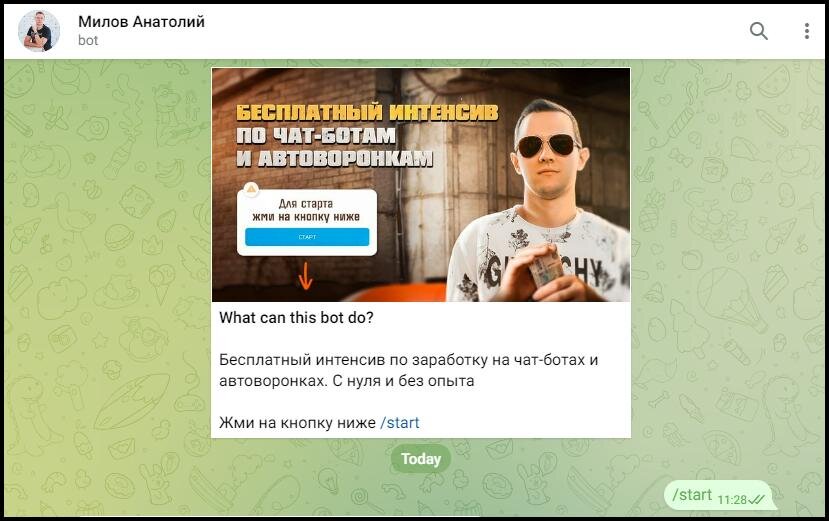 Интерфейс бота полностью выполнен на русском языке. Онлайн-курс ведет Анатолий Милов. Интерфейс простой и удобный в использовании.
