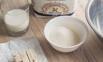 2) В удобной емкости соединяем свежие дрожжи с теплым молоком. Сюда же всыпаем сахар и 50 грамм просеянной муки. Размешиваем венчиком и убираем в тепло на 30 минут.