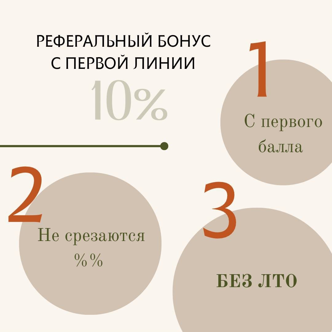 Теперь полные 10% бонуса начисляются со всех заказов первой линии, всегда и без каких-либо условий ЛТО. Это означает, что ваш доход будет стабильным и надежным, а также платят за всех - как за потребителей, так и за партнеров.