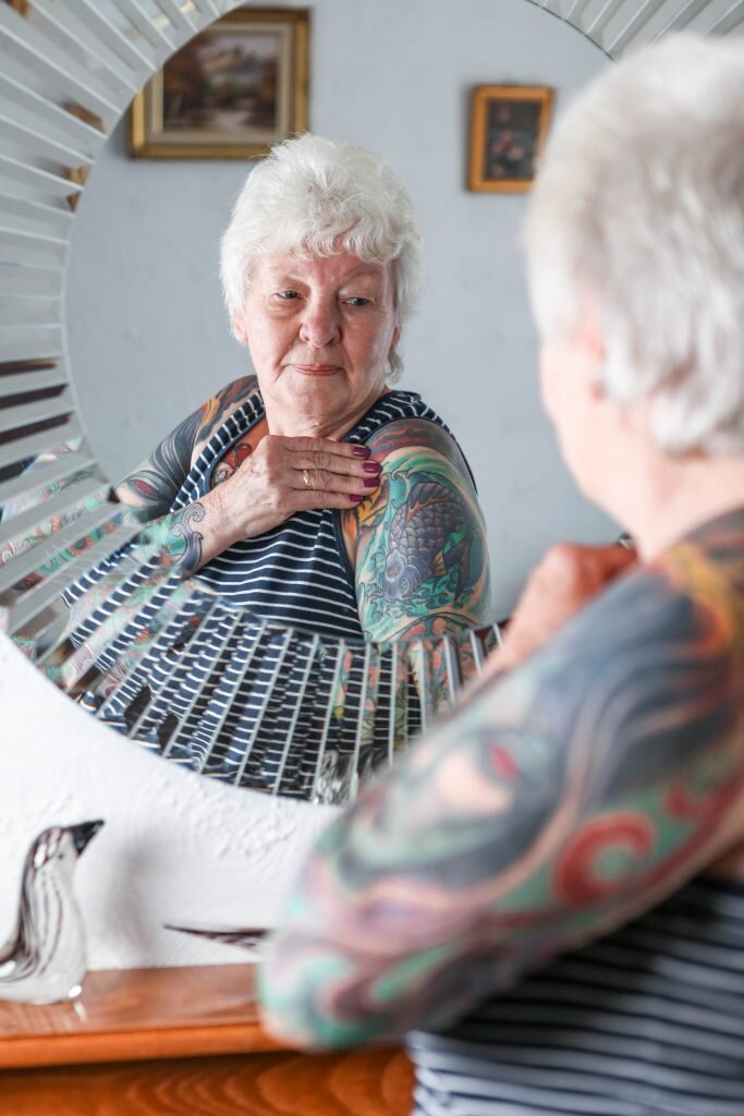 77-летняя Гленис – настоящий пример того, как можно оставаться молодым духом и не бояться экспериментировать с собственным обликом в любом возрасте. Представьте себе эту непредсказуемую женщину, которая каждые два-три месяца отправляется в местную тату-студию, чтобы украсить свое тело новым узором. Для большинства пожилых людей такое хобби может показаться эксцентричным или даже безумным, однако для Гленис это стало обычным делом лишь пару лет назад.
