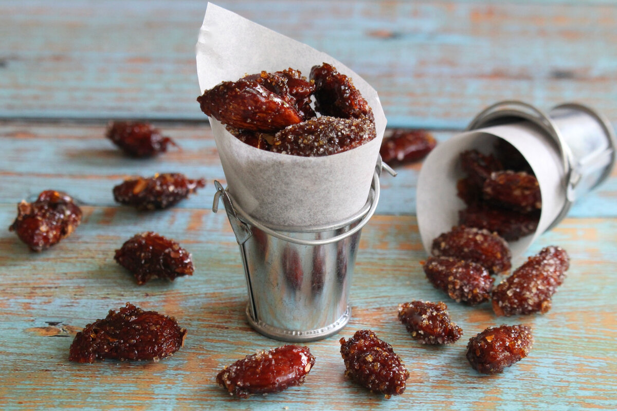 Лакомство для любителей сладких косточек и орехов. Такой миндаль отлично подходит для постных дней, когда хочется что-то сладкое, а разнообразные сладости не подходят для постного стола. Готовится это лакомство очень просто и быстро. Дополнительно готовый миндаль можно сделать ароматным и присыпать корицей или добавить ванильный экстракт. Косточки получаются сладкие, вкусные, хрустящие. Ингредиенты: Миндаль - 300 г. Сахар - 250 г. Вода - 120 мл. Сахар выложим на сковороду. Добавим к сахару воду. Добавим на сковороду миндаль и ставим сковороду на небольшой огонь. Постоянно помешиваем и готовим миндаль до полного выкипания воды. Снимаем сковороду с огня и продолжаем постоянно перемешивать. Нам нужно, чтобы косточки стали сухие. Возвращаем сковороду на огонь и снова помешиваем. Сахар начнет плавиться и миндаль будет в карамели, косточки станут гладкие, темные, глянцевые, блестящие. На этом, лакомство готово. Часть миндаля я еще дополнительно обваливаю в сахаре, пока косточки горячие. У ме