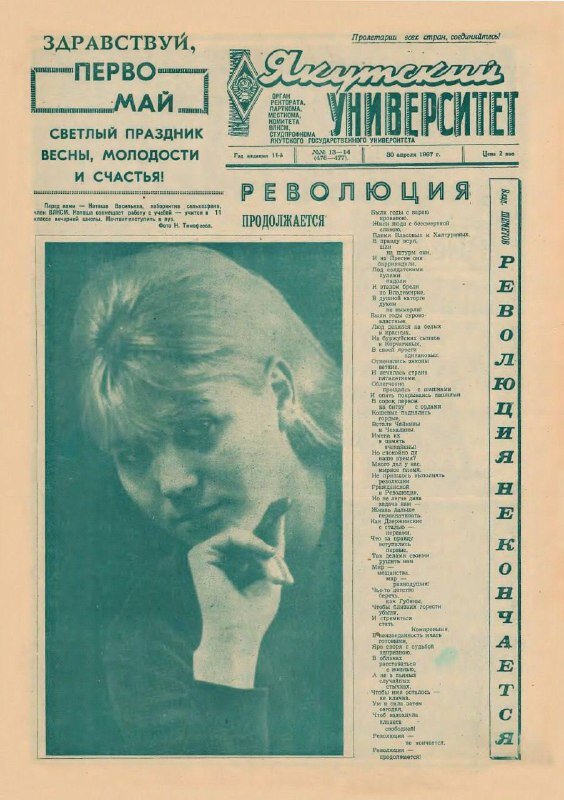 Первомайский номер газеты «Якутский университет» 1967 года описывает жизнь студентов ЯГУ – мы видим, что у студенчества во все годы радости и события похожие. Жизнь кипела: молодежный фестиваль, студенческая наука, экспедиции, известные профессора в гостях, распределение выпускников. На обложке – лаборантка сельхозфака, член ВЛКСМ Наташа Васильева. Может быть, кто-то из наших подписчиков узнает ее?