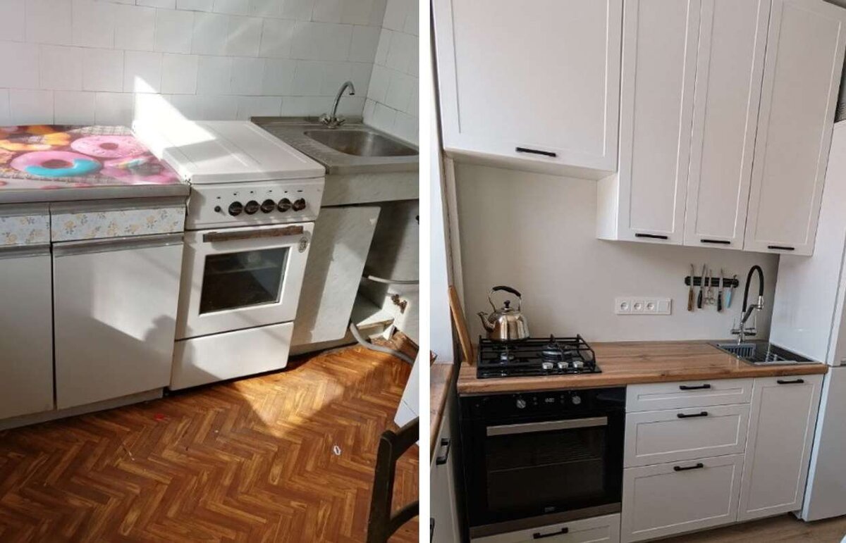 Когда кухня настолько крошечная, необходимо высчитывать все до сантиметра — наша героиня поступила именно так. Ширина холодильника — 54 см, гарнитура — 160 см. В результате рабочая зона — 70 см, включая подоконник. По словам хозяйки, ей всего хватает.